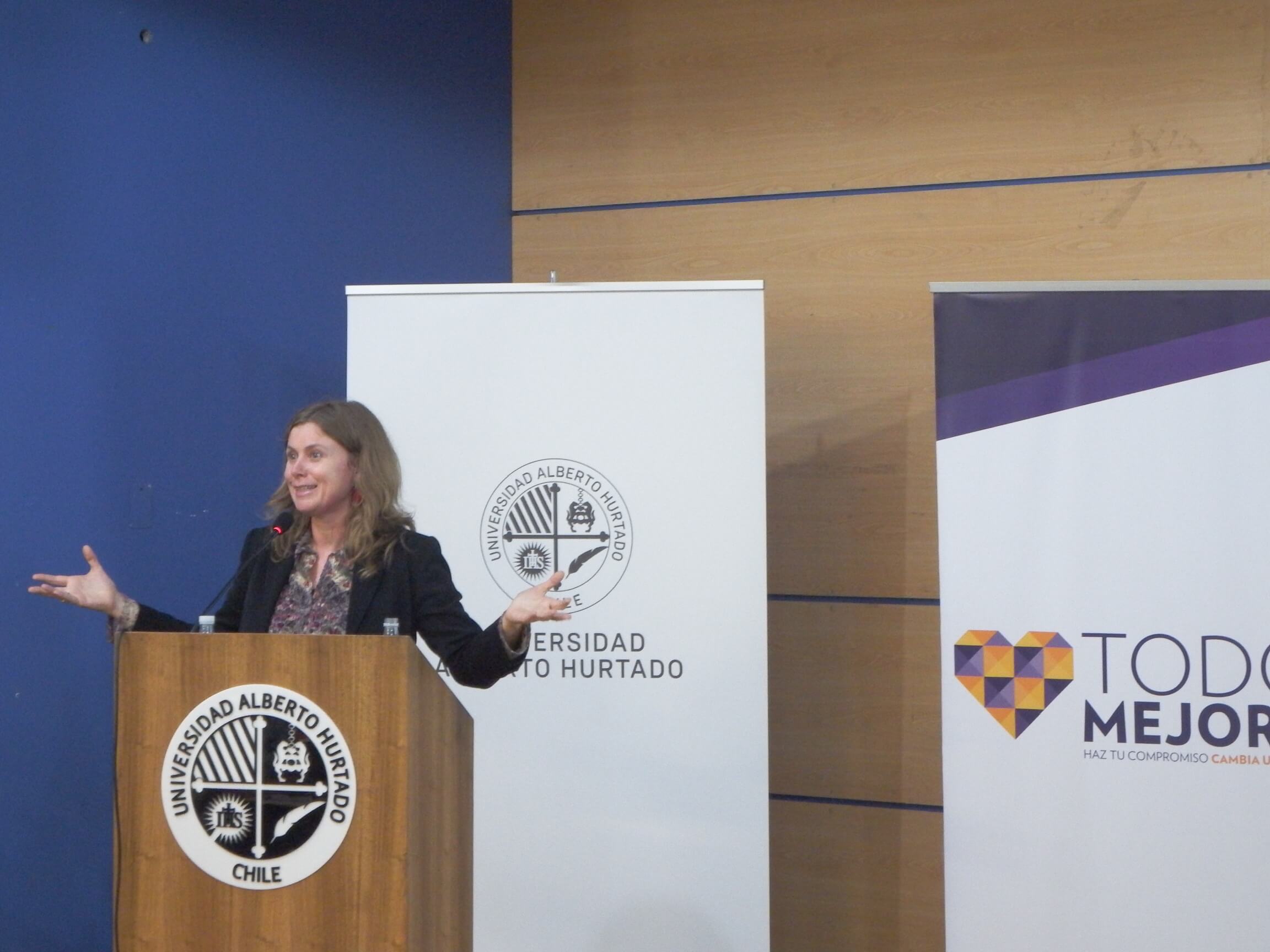 La académica María Teresa Rojas de la Facultad de Educación presentó los resultados del primer estudio LGTBI en establecimientos escolares del país “Narrativas, Prácticas y Experiencias en torno a la inclusión LGTBI en escuelas de Chile. Rojas señaló que no hay que esperar que cambie el marco curricular para trabajar este tema, “sino que debemos agregar actividades específicas de visibilidad. La responsabilidad no recaen en nuestros profesores, pero lo que los profesores decidimos es aumentar la variabilidad de actividades que podemos ofrecer. Revisar nuestros lenguajes, nuestros ejemplos y el tipo de experiencia que brindamos en el aula”.