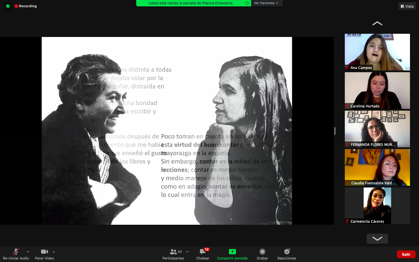 Durante la ceremonia, las académicas del curso Complementario de Mediación de Lectura, Pilar Echeverría, Andrea Bravo y Cecilia Carnavelli regalaron a las graduadas y graduados una selección de textos de Gabriela Mistral y Violeta Parra en torno a la educación, la infancia y la poesía.